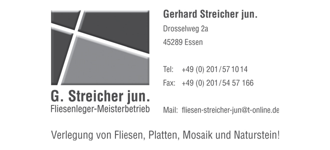 Gerhard Streicher jun.Fliesenleger-MeisterbetriebDrosselweg 2a45289 EssenTel: 0201 / 57 10 14Fax: 0201 / 54 57 166E-Mail: fliesen-streicher-jun@t-online.de